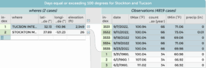 Now that you’ve transformed the data to include new attributes for year, decade, and season, you can investigate how the number of hot days has been changing for the Stockton, CA and Tucson, AZ.
