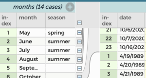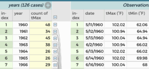 The month attribute enables you to create a season attribute. Drag month to the left of the table. Then, create a new attribute there named season. For each month, type in the season that corresponds to it manually. Drag the month and season attributes back to the right side of the table and note that all 4819 cases will have month and season values.- We can use a similar technique to count the number of extreme heat days per year. First, ensure that the year is left of the main data table. Then, create a new attribute named count of tMax next to it. For this new attribute, enter the formula “count(tMax)” so that you get